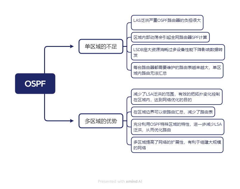 - OSPF引入多区域的设计,将一个OSPF域划分成多个区域,使OSPF能够支持更大规模的网络