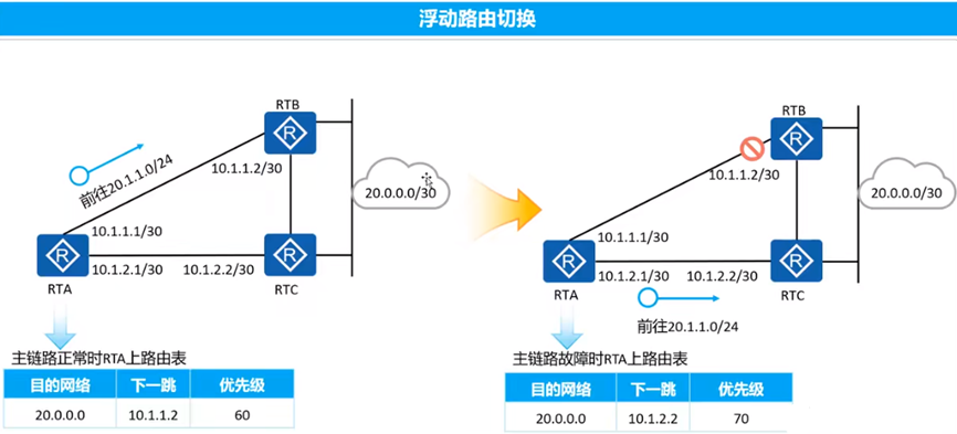 RTA-RTB之间的链路正常时,20.0.0.0/30的两条路由条目都是有效的条目,此时比较优先级,下一跳为10.1.1.2的优先级60,下一跳为10.1.2.2的优先级70,因此下一跳为10.1.1.2的加入路由表。